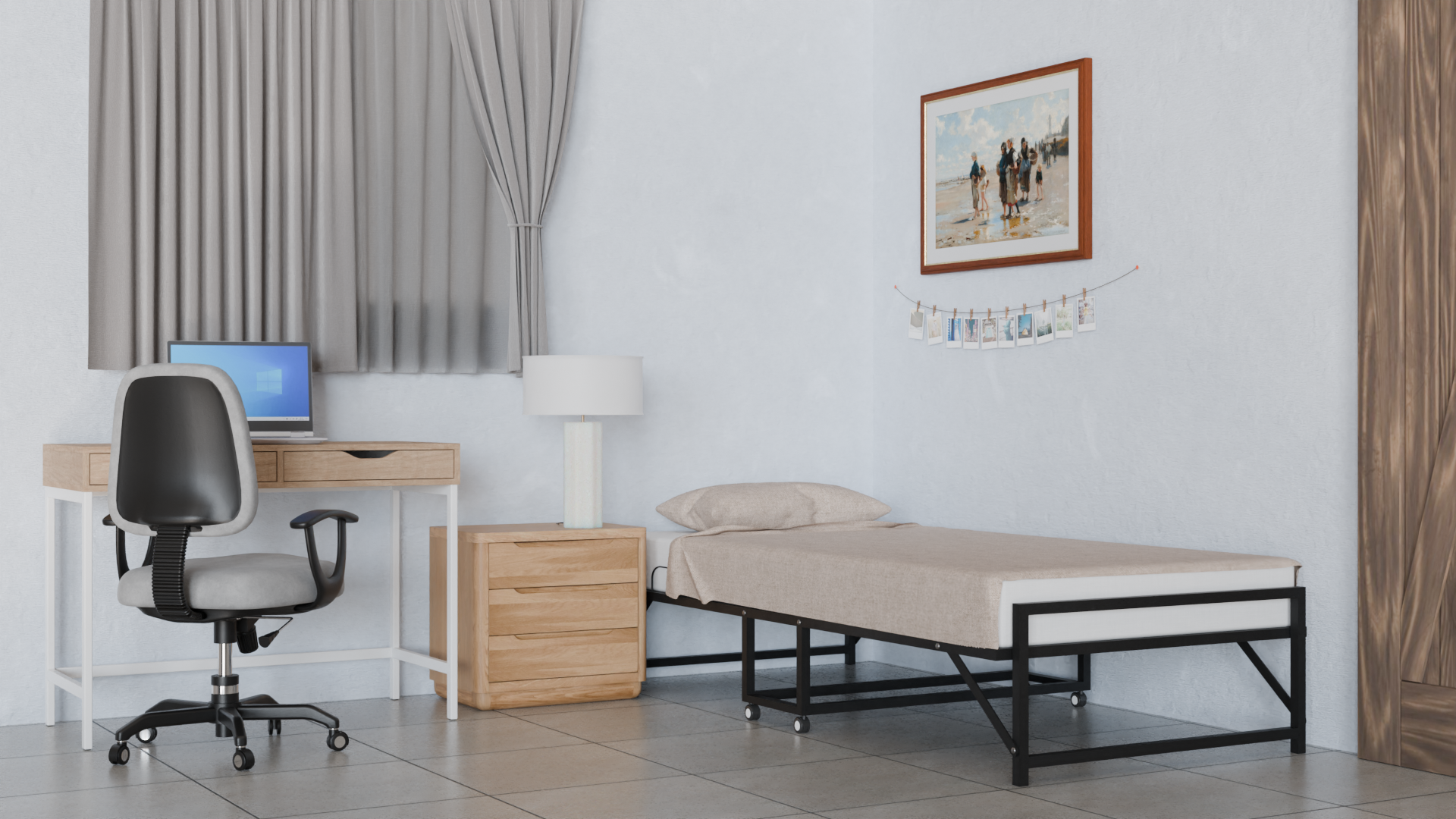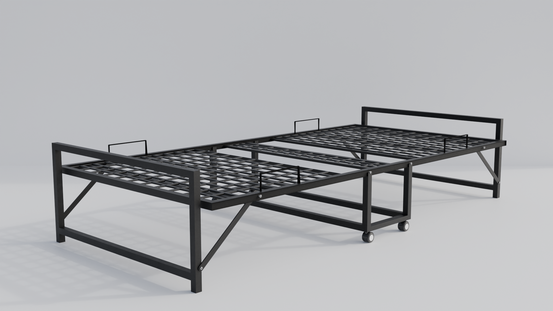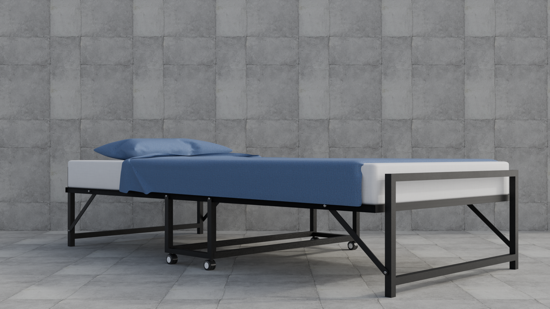 MS Powder coated frame, 360* Caster wheels, mattress arrestor cum head and foot frame, foldable.